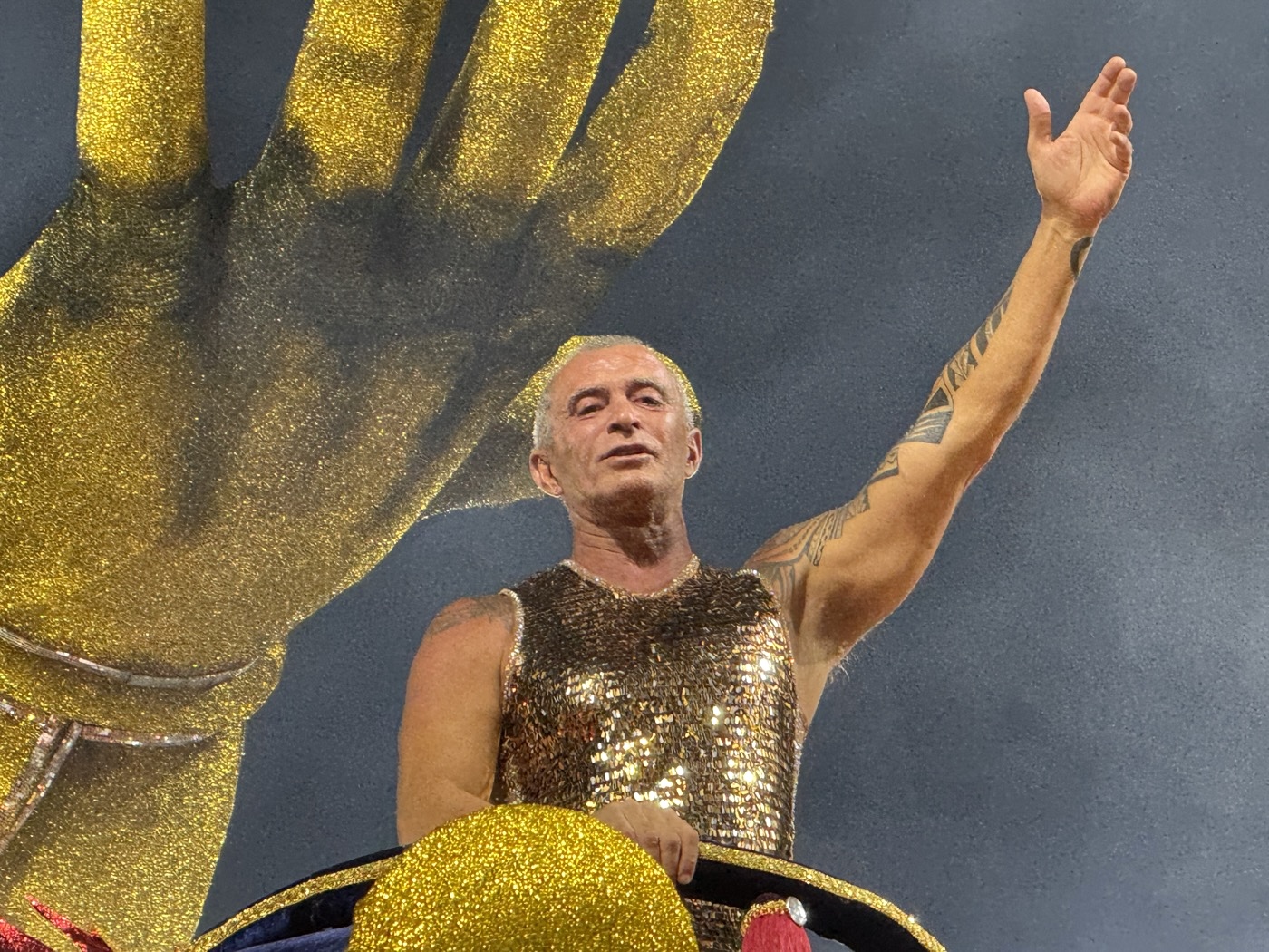 Durante o desfile o gênio veio no alto em cima de uma imponente águia dourada, bem a frente do abre alas, interagindo com o público presente o tempo inteiro. Visivelmente emocionado com a homenagem, antes de subir a alegoria, Paulo chorou na concentração antes da largada da escola.