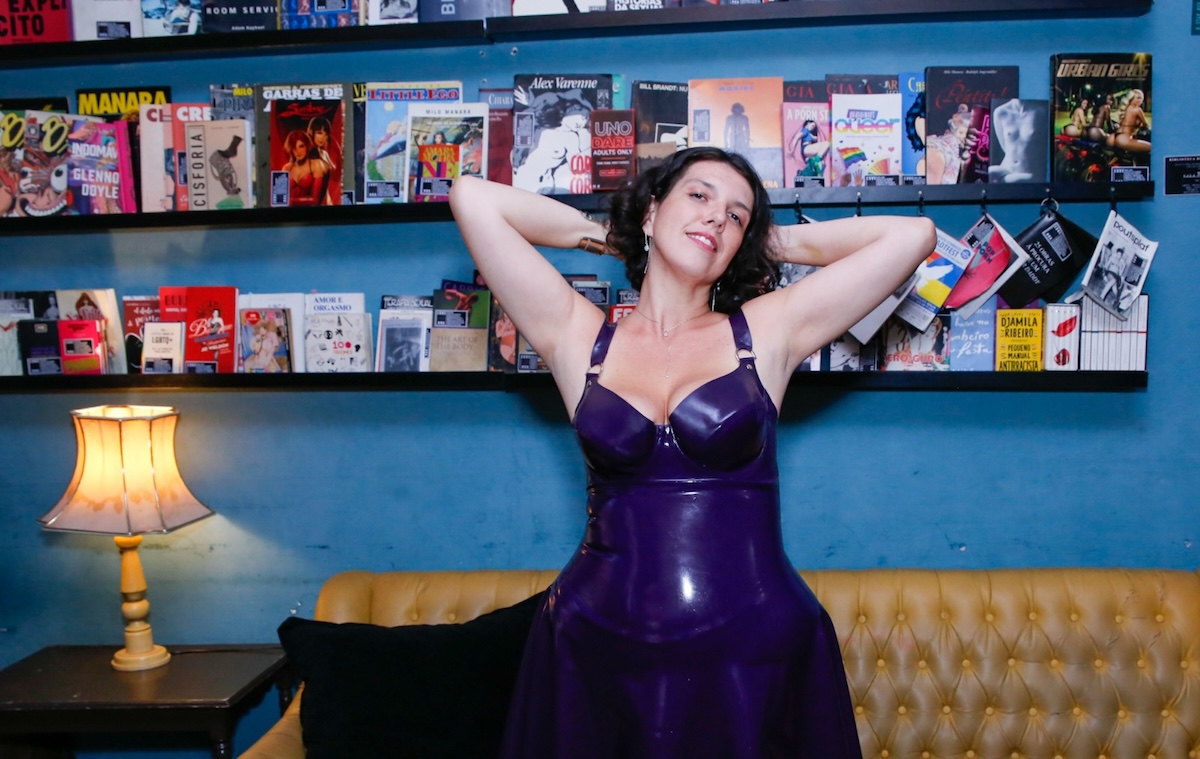 Sacerdotisa Anax Bruxa demonstrando a técnica de massagem nuru aos visitantes, enquanto eles recriaram os movimentos em outros tapetinhos na sala principal da LoveNox.Foto: Fernanda Hekatina